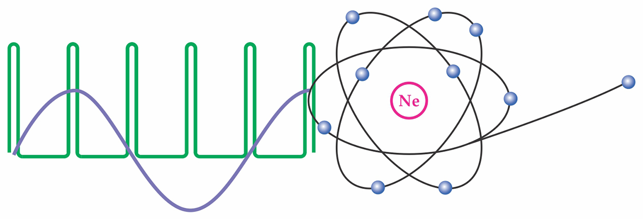 Photoionization of neon probed by a train of attosecond pulses (green) combined with an IR wave (purple). The ionization signal exhibits constructive or destructive interference, depending on the photoionization time delay and the timing offset of the two waves.