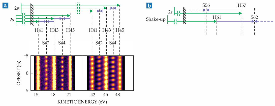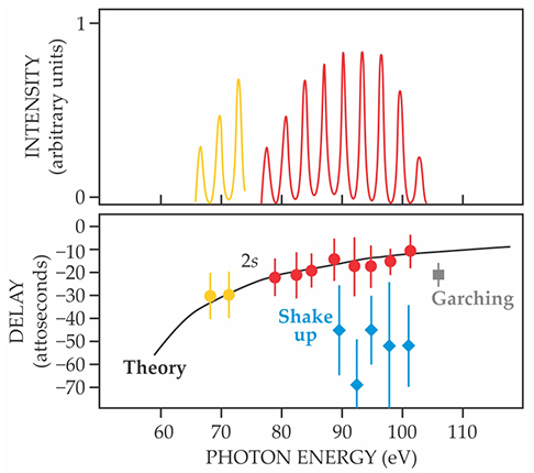By 2014 Johannes Feist of the Autonomous University of Madrid and collaborators had developed their calculations to the point that they could simulate shake-up’s effect on the Ne streaking spectra. 4 They found that shake-up was in fact prevalent enough to affect the measured delay. More recently, Garching’s Martin Schultze and colleagues used attosecond streaking to study shake-up timing in helium. They found that direct ionization lagged shake-up by between 5 and 12 attoseconds, depending on the ionization energy. 5 Shake-up in He is separated in energy from direct ionization by more than 40 eV, so it can be resolved in a streaking experiment. Measuring shake-up in Ne would require a different method.