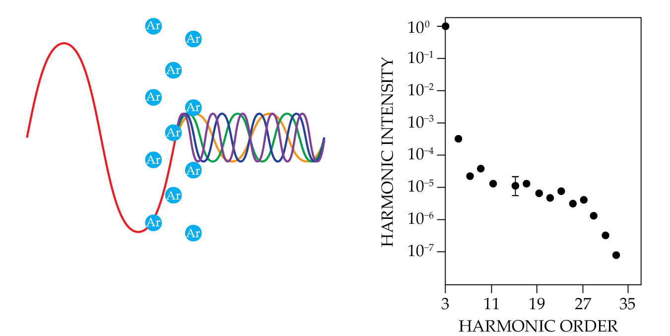 According to the model, HHG is initiated when the laser light’s electric field is strong enough to temporarily rip an electron away from its atom. When the field reverses direction, it slingshots the electron back from whence it came. Finally, the electron drops back into the empty orbital it left behind, and its accumulated energy is released as a high-harmonic photon. That simple picture is semi-classical, but the full quantum mechanical description gives similar results. (See the article by Paul Corkum, Physics Today, March 2011, page 36