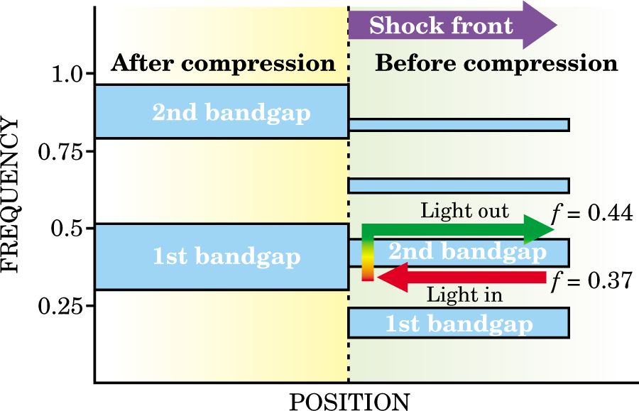 The essential physics of the frequency shifting and light trapping is displayed in figure 1, which depicts the first two frequency bands and bandgaps for the pre- and post-shock crystal. The MIT group designed their virtual crystals to have the first bandgap in the compressed region overlap with the second bandgap in the region that has yet to be shocked.