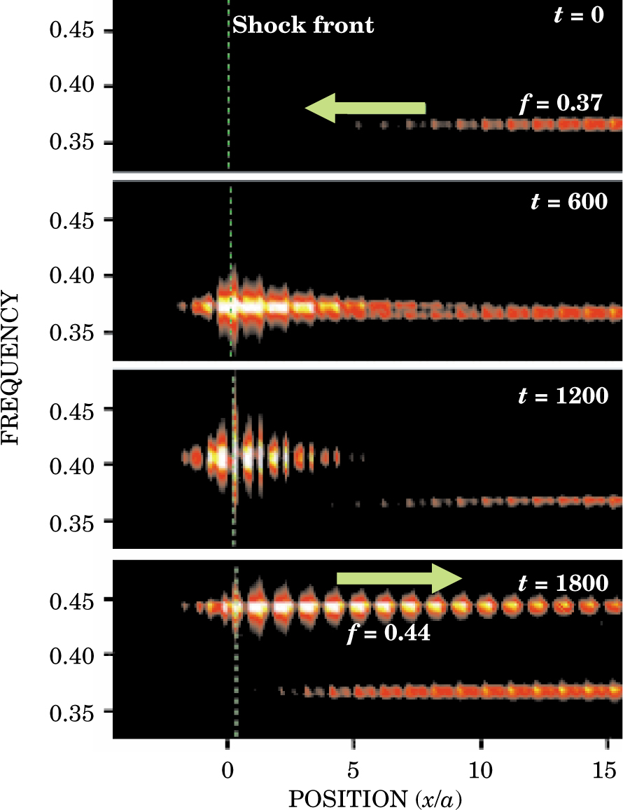 Figure 1. Bands and gaps evolve when a shock wave propagates in a photonic crystal. Simulations reveal that light approaching the shock front with a frequency below the second bandgap can reflect off the shock front with a frequency above the gap. The dimensionless frequency f is measured in units of c/a where a is the pre-shock lattice period and c is the vacuum speed of light.