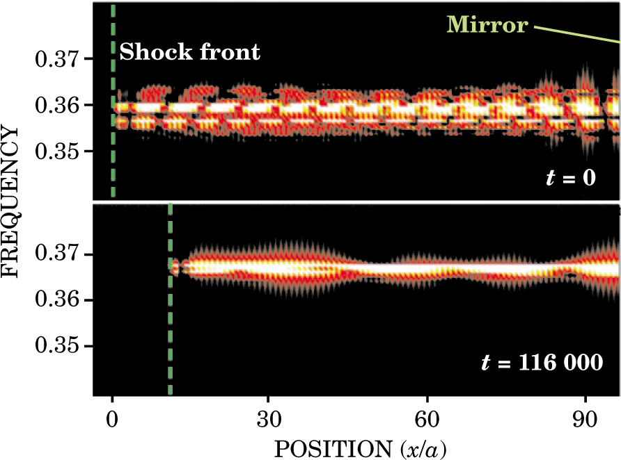 Figure 2 shows snapshots of the evolving light. Initially, light with a well-defined frequency approaches the shock front. As the light interacts with the front, the frequency of the light blurs, but generally ratchets upward. The result of the trapping and ratcheting of light is a pulse with a well-defined, raised frequency. Pulses exit at a rate set by the time required for the shock front to travel one lattice period.