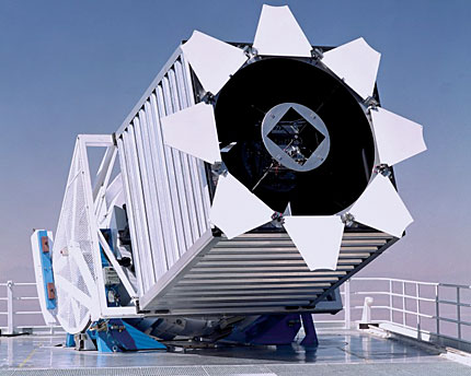 Investigating the nature of the “dark” vacuum energy (DE) that’s presumed to drive the present acceleration of the cosmic Hubble expansion requires tying the redshifts z of distant objects to independent measurements of their distances. One such method involves measuring both z and celestial position for large numbers of galaxies, in search of a spatial-correlation feature of known length at different values of z. That baryon-acoustic-oscillation (BAO) correlation length is attributed to sound-like waves in the early universe’s hot-plasma epoch. At the epoch’s abrupt end, the plasma waves became density fluctuations of ordinary “baryonic” matter that remain imprinted on the spatial distribution of galaxies (see Physics Today, April 2008, page 44). How the BAO correlation length at any particular z looks from here and now (z = 0) measures our distance from that z. The Baryon Oscillation Spectroscopic Survey (BOSS) collaboration has now reported its analysis of more than a million galaxies measured with the Sloan Foundation’s 2.5-meter-aperture survey telescope in New Mexico (shown in the photo). The BOSS sample covers almost a quarter of the sky to a depth of z = 0.7, which corresponds to a look-back time of 6 billion years. The analysis measures the effective distance to objects at z = 0.57 with a record precision of 1%, and it yields an improved measurement of the DE’s pressure-to-density ratio w. If the DE is simply Einstein’s cosmological constant, then w = −1. The BOSS analysis, incorporating complementary cosmological data, yields w = −1.03 ± 0.06. (L. Anderson et al., BOSS collaboration, http://arxiv.org/abs/1312.4877.)