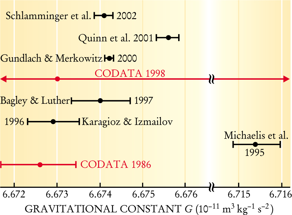 How could there be such a retrogression? Two papers had caught the metrology community’s attention in 1995. First, Winfried Michaelis and coworkers at the Physikalisch-Technische Bundesanstalt (PTB), Germany’s national standards laboratory, measured G to be more than 40 standard deviations higher than the 1986 CODATA value. 2 (See the figure at right.) Like most of the frontier measurements of G in recent decades, the PTB experiment used a modern variant of the torsion-balance design that goes back two centuries to the celebrated measurement by Henry Cavendish. Also in 1995, Kazuaki Kuroda, at the University of Tokyo, published an analysis that warned of the distorting effect of frequency-dependent nonlinearities in the torsion fibers of such instruments. 3 Cavendish’s balance was a dumbbell hanging from a torsion fiber, upon which nearby masses exerted a gravitational torque