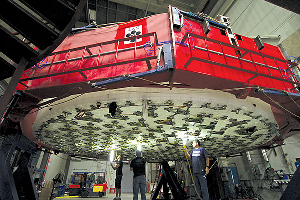 Inspectors check out the back of one of seven 8.4-m mirrors that will make up the primary mirror of the Giant Magellan Telescope.
