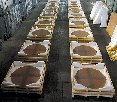 Some 492 glass segments, each 1.42 m in diameter, will make up the primary mirror of the Thirty Meter Telescope. These circular blanks will be cut to form hexagonal tiles. They were made in Japan, which is contributing a quarter of the cost to build the TMT; among Japan’s other contributions is the main structure for the telescope.