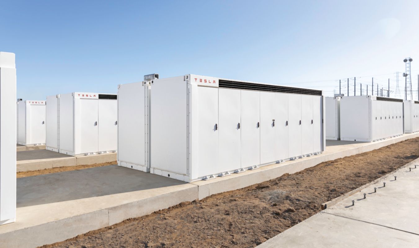 Tesla Megapack lithium-ion batteries located at a PG&E substation in Northern California. When completed later this year, the facility will be capable of dispatching energy to the grid at the rate of 182 MW for up to four hours.