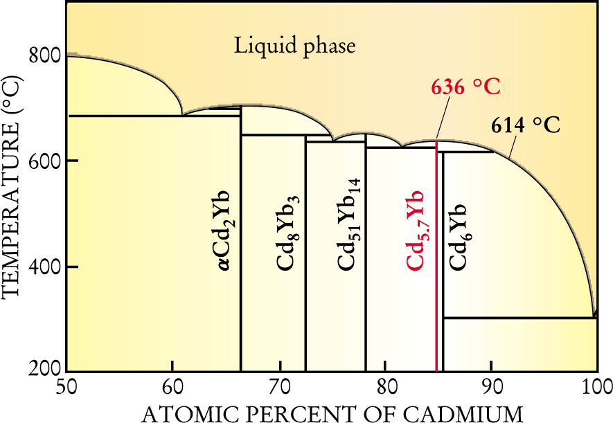 Figure 1. Binary phase diagram of cadmium–ytterbium alloys. The looping curved line marks the boundary between the liquid phase above and the solid phases below. Shown in red is the quasicrystalline Cd5.7Yb, whose stoichiometry is almost identical to its closest neighbor on the phase diagram, the cubic Cd6Yb.