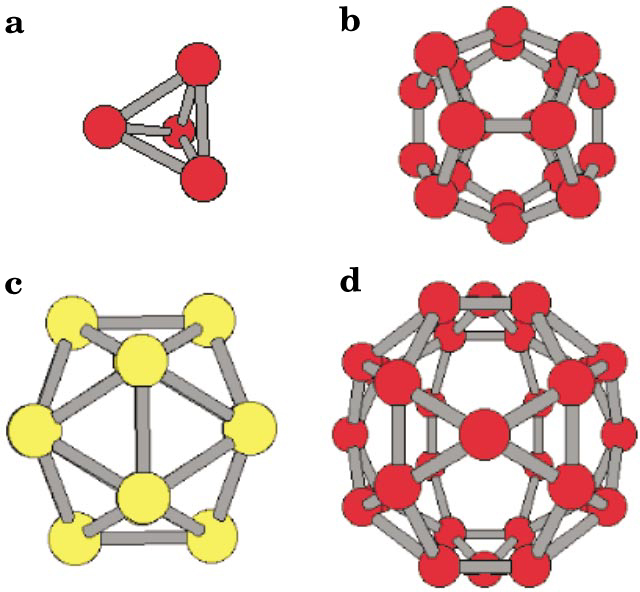 Figure 2. A preliminary structure for the atomic cluster that forms the basis of Cd5.7Yb quasicrystal. Cadmium atoms are shown in red, ytterbium in yellow. Like a Russian doll, the successively smaller units (c, b, a) fit within the largest unit (d).