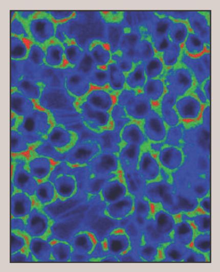 Figure 1. With fluorescent dyes whose spectral properties and spatial distribution are influenced by local electric fields, researchers can measure transmembrane voltages in cell populations (shown here), tissues, and whole organisms. (Adapted from ref.