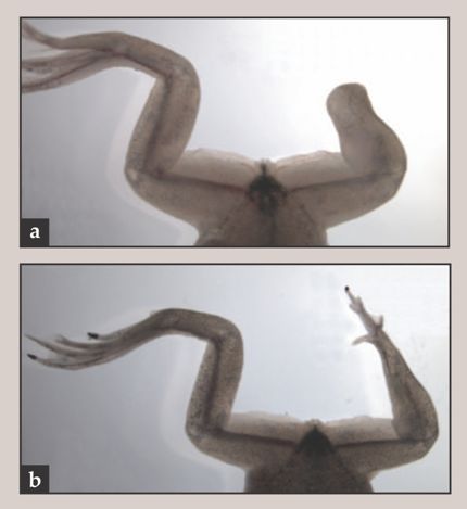Figure 2. Frogs’ legs don’t normally regenerate: Cutting off the developing leg of a tadpole (a) yields a frog with a missing leg. (b) But when the tadpole is given a suitable bioelectric trigger, the missing limb can regrow. (Adapted from ref.
