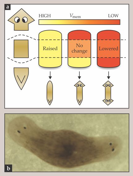 Figure 3. Planarian flatworms can regrow new tails and even new heads. The regeneration is guided by a head-to-tail gradient (a) in the transmembrane electric potential Vmem. Interfering with that gradient by raising or lowering Vmem can produce worms with two heads (b) or with none. (Adapted from ref.