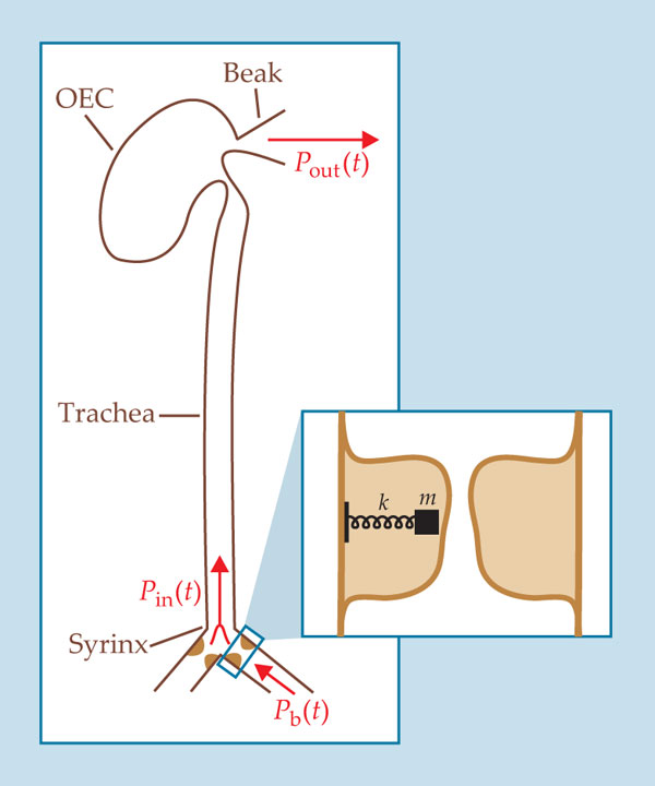 Figure 1 shows a schematic of a songbird’s vocal tract. As the bird exhales, it pushes air through the vocal organ, called the syrinx. Under the right conditions, the flow of air can induce vibrations in folds of tissue called the syringeal labia. Those vibrations set up an acoustic wave, which is modified as it passes through the rest of the vocal tract—trachea, oro-esophageal cavity, and beak—and emerges as an audible song.