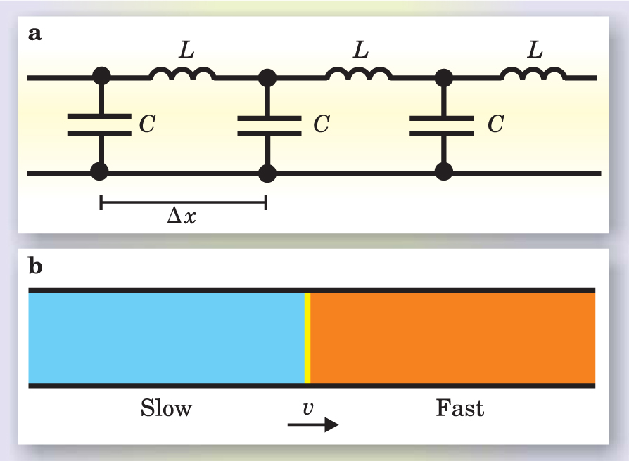 The Schützhold–Unruh waveguide, as illustrated in panel a of the figure, comprises a large number of cells, each of length Δx and each including a dielectric capacitor and an inductor. To create a horizon for electromagnetic waveguide modes, the two theorists suggest sweeping a laser beam rapidly along the guide, say from left to right, so as to excite the material in the capacitors and increase its dielectric constant. That increase means the speed of light in the guide will be slower to the left of the laser spot than it is to the right, as shown in panel b of the figure. If the laser spot moves at a rate intermediate between the light speeds in the two sides of the guide, then the location of the spot is a horizon for mode propagation. An observer moving with the horizon can see modes cross the horizon from the right, but any mode excited to the left of the horizon must propagate to the left, just as the unfortunate salmon in a strong current is inevitably swept downstream.