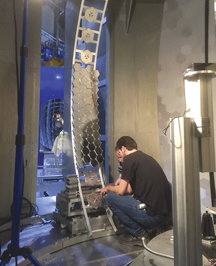 Kristijan Kuhlmann (front) and Markus Appel (back, almost hidden) examine part of a gallium arsenide analyzer in a proof-of-concept neutron backscattering spectrometer. In a fully functional spectrometer, the hexagonal GaAs facets will cover about 20% of the surface area of a sphere centered on the sample (right foreground).