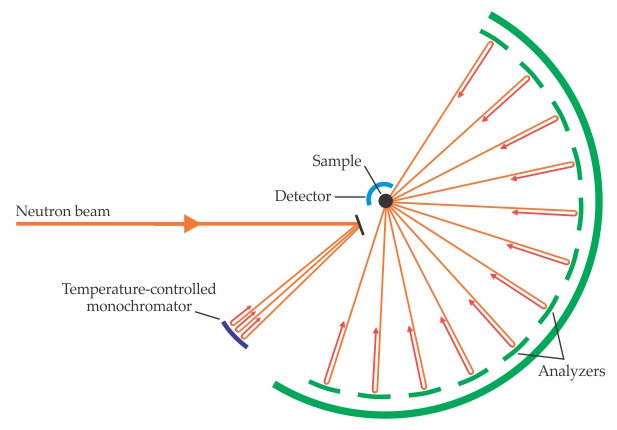 After scattering off the sample, which may or may not involve a slight change in energy, the neutrons collide with a large spherical shell of crystalline analyzers. If and only if the Bragg condition is satisfied again are the neutrons reflected back toward the detector. If the monochromator and analyzers are made of identical crystalline materials, then, the detected neutrons are the ones that neither gain nor lose energy in the sample. By adjusting the monochromator’s temperature, one can select for neutrons that gain or lose a specific amount of energy: Warmer crystals have slightly larger lattice spacing, so they reflect slightly longer-wavelength neutrons.