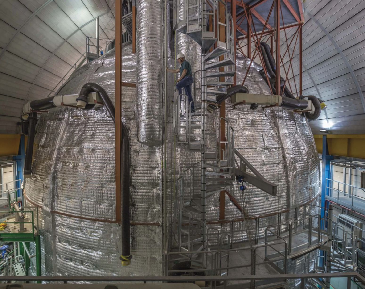 The Borexino neutrino detector, after being wrapped in an aluminum-reinforced wool blanket in 2014 and after the installation of a temperature control system in 2019. Solar neutrinos are detected in its inner 8.5-meter-wide balloon filled with 280 tons of petroleum-based scintillator liquid. The scintillator emits flashes of light when the neutrinos scatter from its electrons.