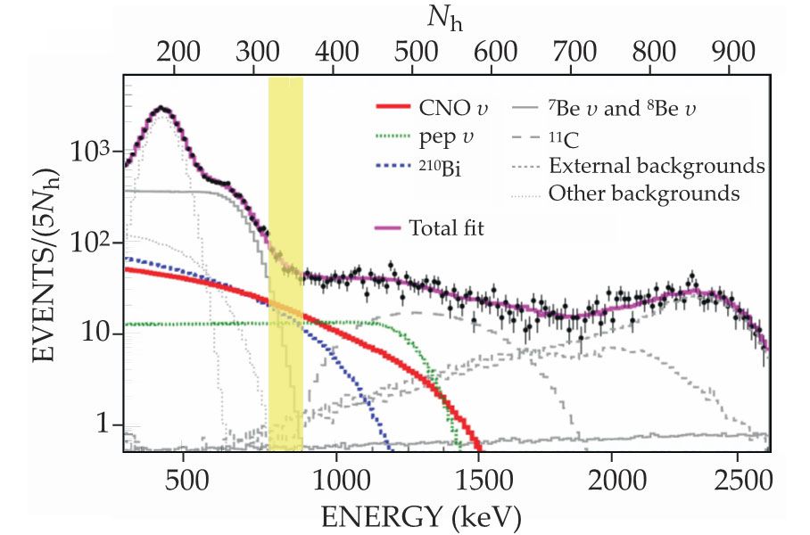 The CNO experiment ran from July 2016 to February 2020, with 1072 days of live time. The collaboration filtered the number of events in the detector’s 100-ton fiducial volume by applying selection criteria that removed contributions due to impurities, cosmogenic isotopes, and instrumental noise. Figure