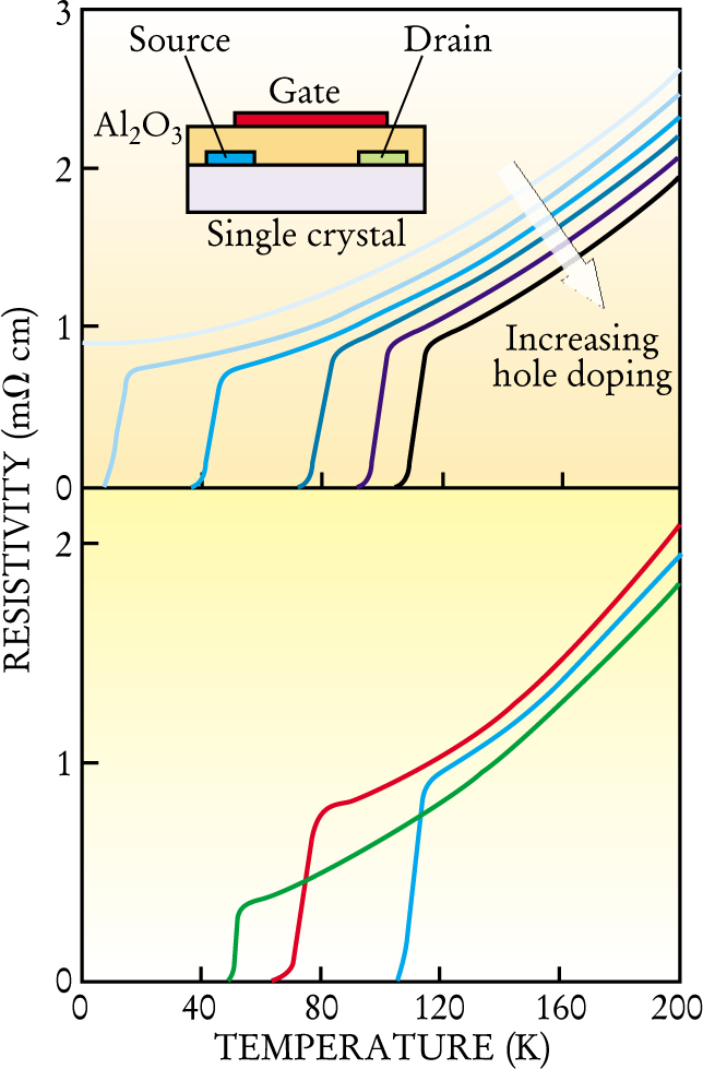 Onset of superconductivity in C60 crystals varies with the degree of hole doping and with the size of the intercalated molecules. As seen in the top panel, when tribromomethane (CHBr3) molecules sit between the C60 spheres, the critical temperature Tc (where resistivity drops) gets higher for higher levels of hole doping. As seen in the bottom panel, Tc = 52 K for a pure C60 crystal (green curve) and rises to 80 K and 117 K, respectively, when CHCl3 (red) and CHBr3 (blue) molecules slip into the lattice. The inset shows the field-effect transistor setup that electronically “dopes” charges into the single crystal.