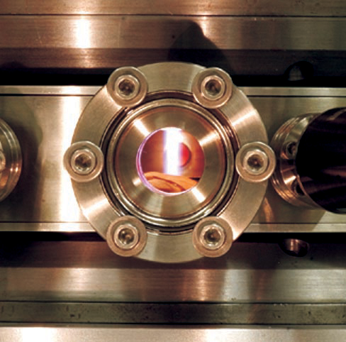 The cyclotron built by Timothy Koeth (above, left) and Stuart Hanebuth is now part of an undergraduate lab course. The dark brown cylinders are the coils that excite the 12-inch magnet (beige central cylinder). The ion beam, visible through the small central window (inset), can consist of pure protons from hydrogen gas (blue tank) or protons and neutrons from deuterium (green tank).