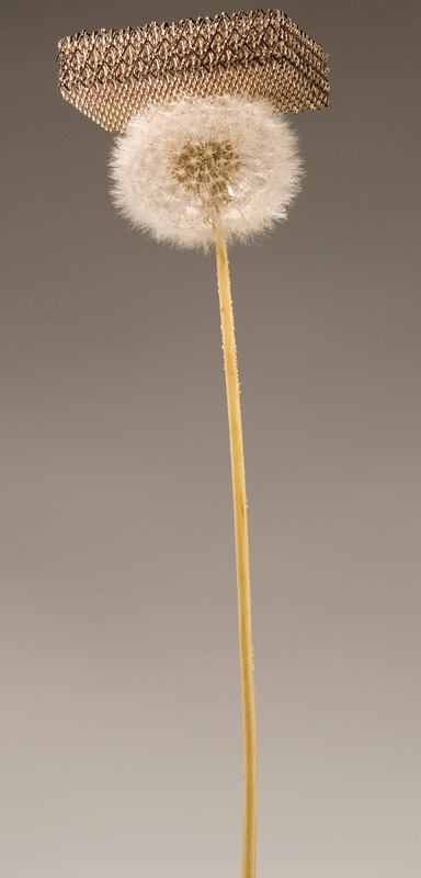The metallic microlattice, shown here atop a dandelion, could be made at a density as low as 0.9 mg/cm3, below that of the lowest-density aerogels but with a Young’s modulus—a measure of stiffness—nearly two orders of magnitude greater. Although the researchers opted for an octahedral unit cell, they could have created a variety of architectures by altering the mask pattern and the light’s angle of incidence. The new method thus offers a greater level of flexibility than ones currently used to make metal foams and aerogels.