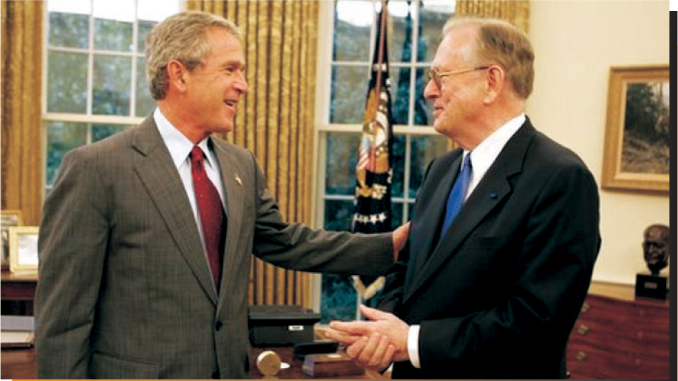 President Bush congratulates Arden Bement.