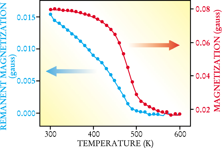 Figure 2. Falloff of magnetization for rhombohedral carbon-60 (red), measured at 0.2 tesla, indicates that the Curie temperature is around 500 K. Remanent magnetism (blue) is the magnetism at zero magnetic field determined from hysteresis curves.