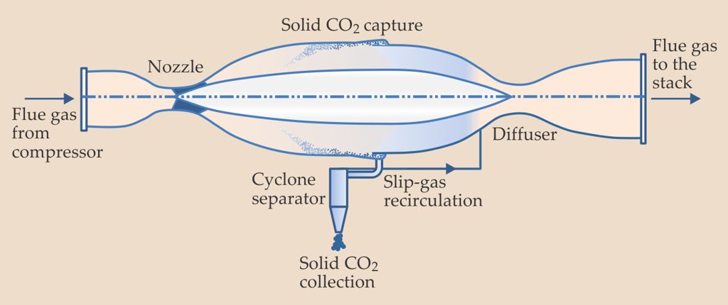 A carbon capture process under development at Alliant Techsystems accelerates compressed flue gas through a nozzle to supersonic speeds. The CO2 desublimates and is collected as dry ice. The technology is one of 15 novel approaches to carbon capture that have been supported by the Advanced Research Projects Agency–Energy.