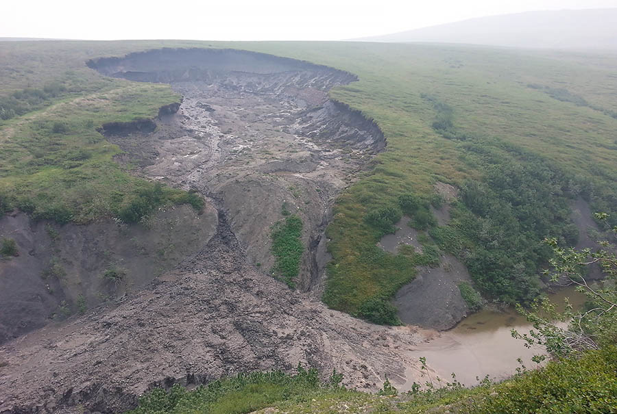 The Mackenzie River, which is central to the basin, saw a 45% increase in sulfate flux with 2.3 °C of warming over the study period. One catchment had sulfate concentrations that rose by as much as 36% per decade. Others showed no significant changes in sulfate concentrations. Steeper slopes, more exposed bedrock, and more permafrost were all associated with faster increases of sulfate concentration. Melting permafrost produced major landscape changes—such as a thaw slump observed in the Peel River, shown in the photo—that increased exposure of sulfides to weathering. Peatland cover had the opposite effect. And the types of rocks present control the reactions—places with both sulfide- and carbonate-rich rocks contribute the most to increased CO2 emissions.