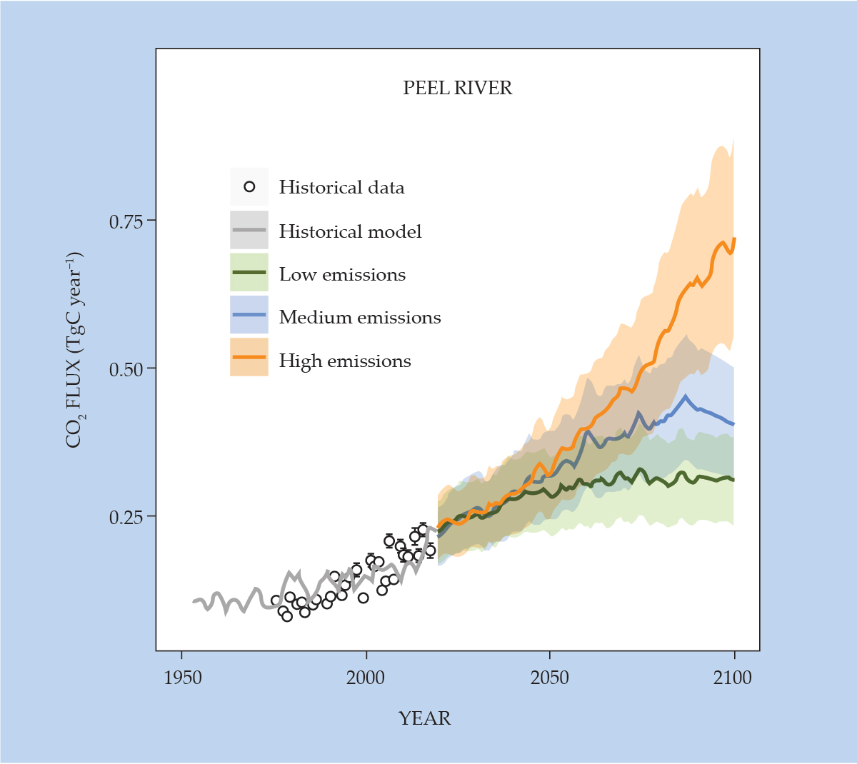 Historical estimates and future projections for the flux of carbon dioxide from the Peel River watershed highlight the way that temperature increases over time could increase the release of carbon dioxide from the Arctic landscape. Projections are shown for three emissions scenarios adopted by the Intergovernmental Panel on Climate Change. Black circles represent data collected by Environment and Climate Change Canada. Credit: Adapted from E. V. Walsh et al., Sci. Adv. 10, eadq4893 (2024)