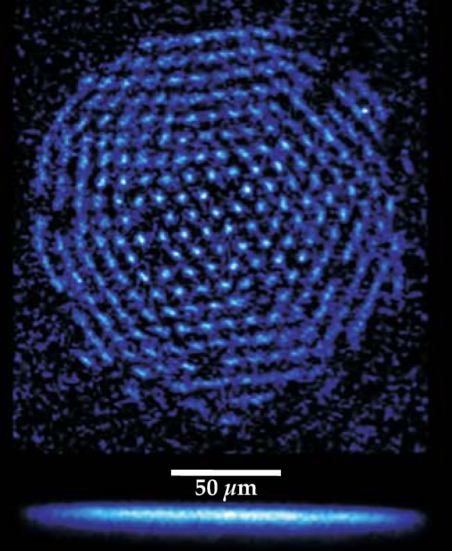 Figure 1. Beryllium-9 ions in a Penning trap settle into a pancake-shaped Coulomb crystal, shown here from above (top) and the side (bottom). The trap’s magnetic confinement field splits the ions’ 2s → 2p transitions into a fluorescent spin-up level and a dark spin-down level. NIST researchers use the fluorescence to measure how long the ions retain coherent superposition of spin-up and spin-down states.