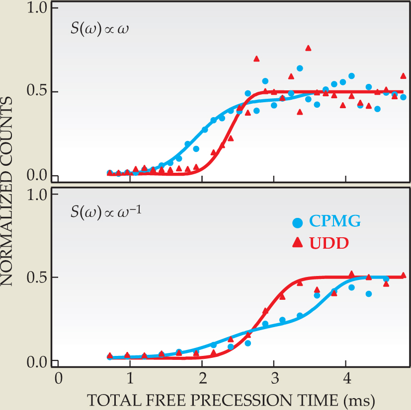 If the trapped 9Be+ ions were part of a real quantum computer, their performance-limiting noise would come primarily from magnetic-field fluctuations, which shift the Zeeman transition. In the NIST experiment, the decoherence-inducing effect of a fluctuating magnetic field, or indeed any environmental source of noise, can be mimicked by modulating the microwave control system. When no modulation is applied, S(ω) ∝ ω-4, and UDD provides no advantage over CPMG. But as Figure 2 shows, UDD outperforms CPMG when S(ω) ∝ ω, confirming Uhrig’s original idea.