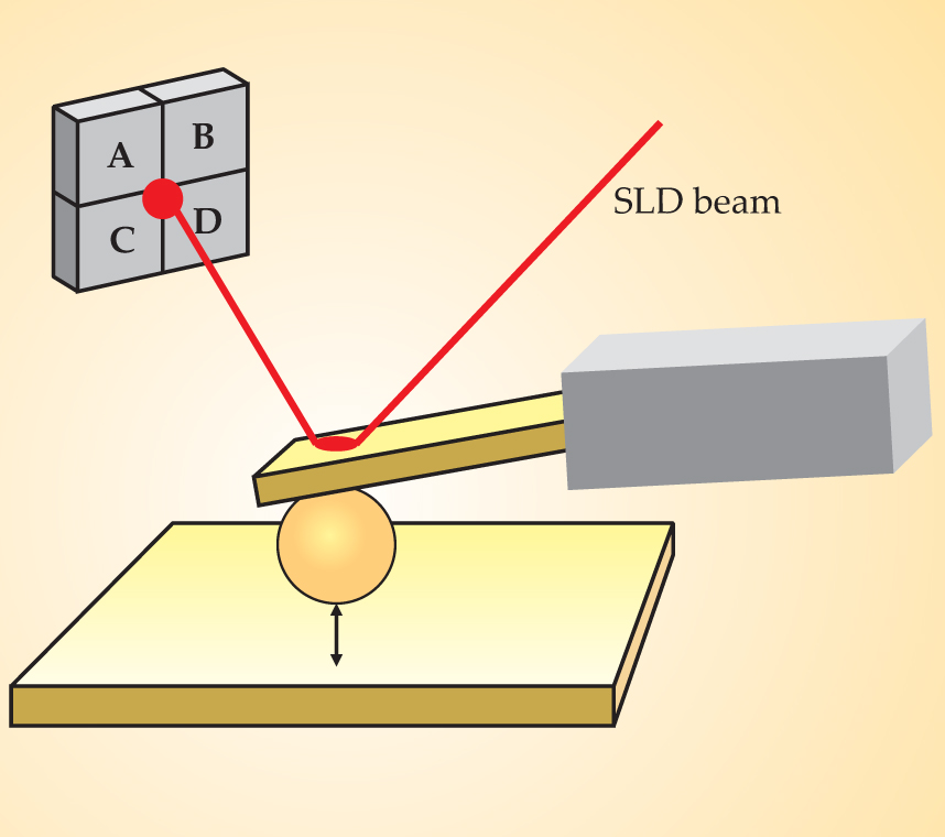Figure 1. Measuring the Casimir–Lifshitz force between a 40-µm sphere and a surface. The sphere is attached to an atomic force microscope cantilever, which is lowered toward the surface by a piezoelectric column. The position of the cantilever is monitored with a super luminescent diode (SLD) and a split-quadrant photodetector. If there is an attraction between the sphere and the plate, more of the SLD intensity is detected in quadrants C and D and less in quadrants A and B.