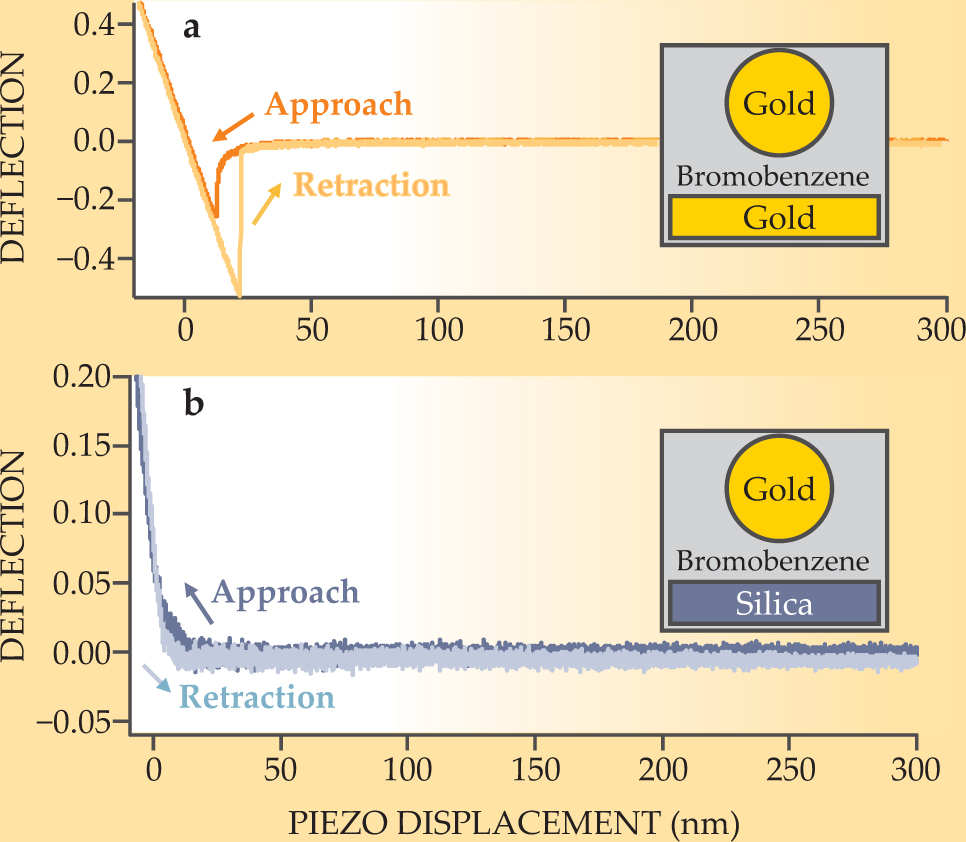 Figure 2. Casimir–Lifshitz forces as monitored by the cantilever deflection (in arbitrary units) as a function of the piezo displacement. A negative deflection means that the sphere was attracted toward the surface, and a positive deflection means that it was repelled. (a) A gold sphere and a gold surface attract each other. (b) A gold sphere and a silica surface, submerged in bromobenzene, repel each other. The diagonal straight lines at the left of both plots indicate that the sphere is in contact with the surface.