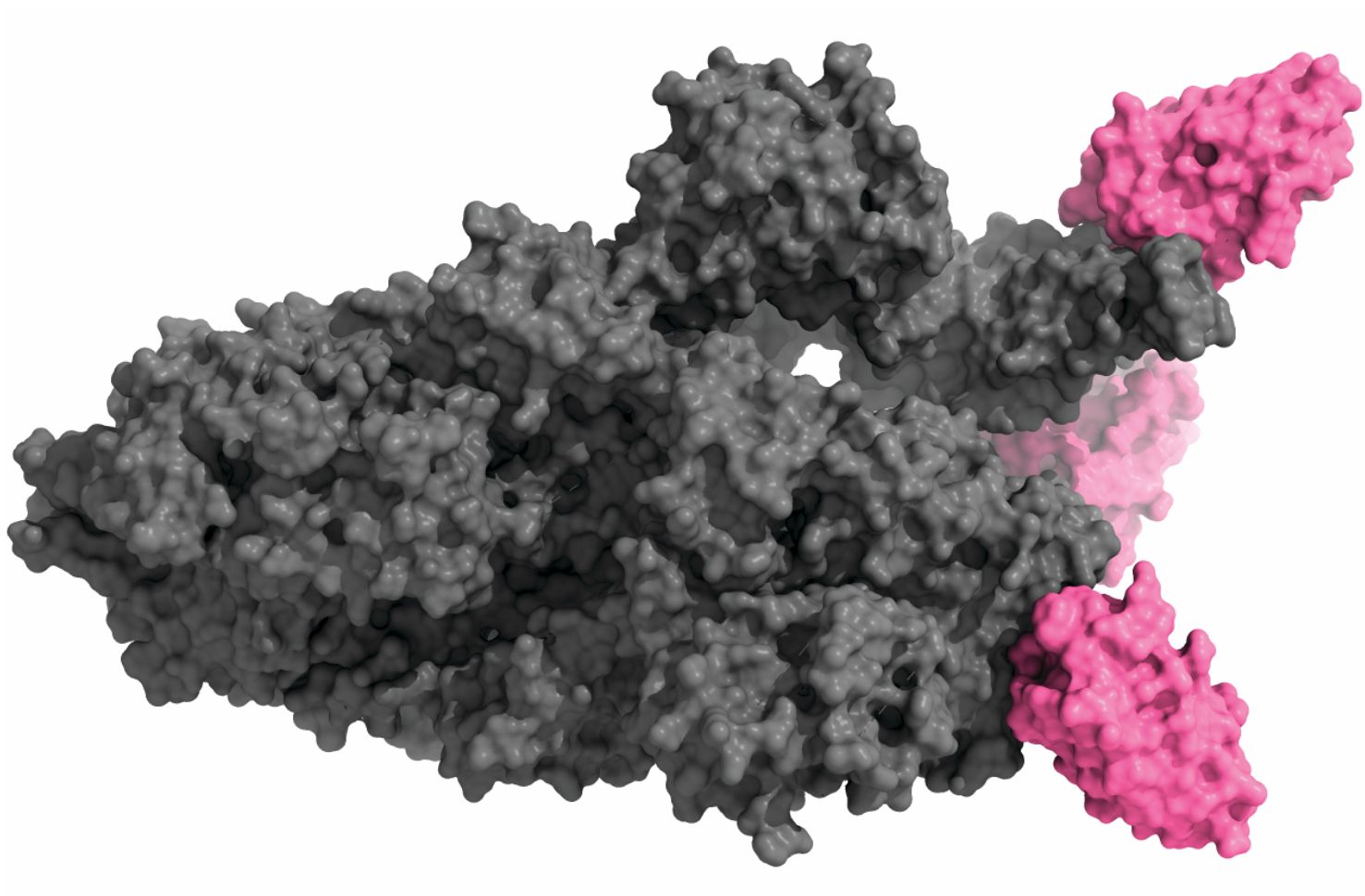 The spike protein of the SARS-CoV-2 virus (gray) is shown with three small antibodies (pink) attached to its receptor binding domains. The spike attaches at the left to the viral membrane (not shown).