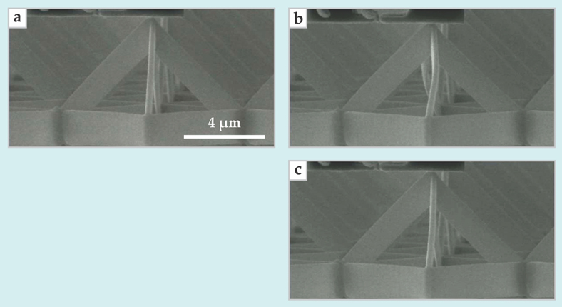 To test the strength of their TiN lattices, the researchers applied a compressive load while observing the system with a scanning electron microscope, as shown in figure 2. When an octahedral lattice was distorted until it broke, it exhibited a tensile strength of 1.75 GPa. (Even though the lattice as a whole was compressed, the failure occurred in a component that was under tension.) In comparison, the theoretical tensile strength for flawless TiN is estimated to be 3.27 GPa. Typical real bulk samples of TiN and other brittle ceramics have tensile strengths in the tens to hundreds of megapascals.