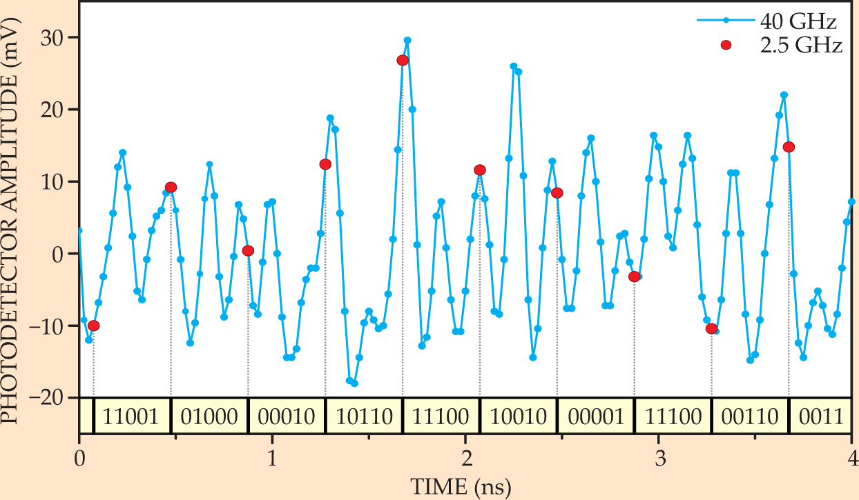 The chaotic output of a semiconductor laser sampled at 40 GHz (blue dots). Researchers from Bar-Ilan University in Israel use the output of one such laser to generate a random binary sequence by digitizing measurements taken at 2.5 GHz (red dots) into eight-bit numbers, taking the differences between consecutive measurements, and retaining from each difference the five least significant bits, shown at the bottom of the figure.