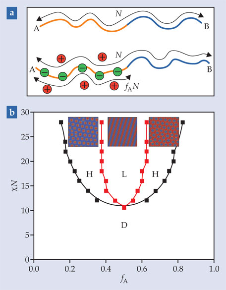 The canonical phase diagram for neutral diblock copolymers, shown in figure 1b, illustrates how, as a function of the fraction fA of A monomers and phase immiscibility χ, the polymers can be disordered or can form layered or hexagonal structures. The phase boundaries are derived from self-consistent field theory (SCFT), which is founded on the assumption that as the polymers move around, each one responds to the mean density of all the others—so instead of solving the many-body problem of all the polymers simultaneously, one need only look at the problem of a single polymer moving in an applied field. For neutral-polymer systems, that assumption seems to be good: SCFT has been successfully used for decades to describe various aspects of phase segregation in neutral polymers and copolymers.