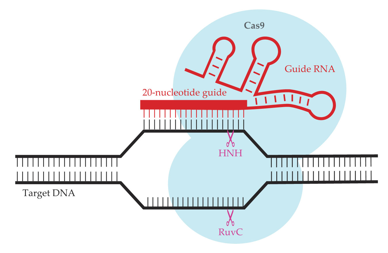 Adapted from a bacterial immune system, the CRISPR-Cas9 gene editor consists of the Cas9 protein (light blue) and a strand of guide RNA (red) that contains a 20-nucleotide guide sequence. The complex seeks out and binds to the complementary DNA sequence; two active sites (HNH and RuvC, purple) then cleave the DNA. (Adapted from ref.