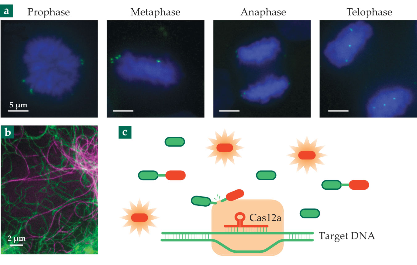 Just a few of CRISPR-Cas’s many applications. (a) Genes tagged with fluorescently labeled dCas9 (green) are imaged at different stages of mitosis. (b) The cytoskeletal protein vimentin (green) in a living cell is made fluorescent by modifying its gene with CRISPR-Cas9. (The protein tubulin, purple, is stained with a fluorescent dye.) (c) Target DNA from a virus is detected with Cas12a, which goes on to cut the DNA tethers holding reporter molecules together. Once cut, the reporter molecules become fluorescent. The detection scheme can be used to test for COVID-19. (Panel a adapted from ref.
