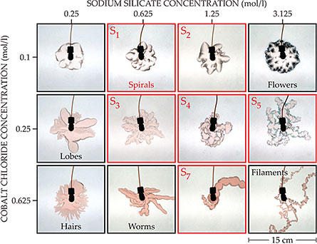 Like Steinbock, they injected one solution into another—specifically, cobalt chloride into a reservoir of sodium silicate or vice versa. But they did so using the quasi-two-dimensional geometry of a Hele–Shaw cell, in which the reservoir sits in the half-millimeter gap between two horizontal acrylic plates. The confinement effectively eliminates the buoyancy force.