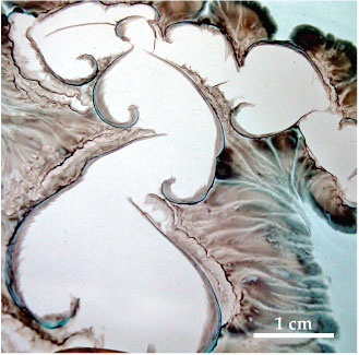 A general trend was for precipitation patterns to become circular if one reagent is much more concentrated than the other. When Na2SiO3 is used at its highest concentration, for example, it is an order of magnitude more viscous than CoCl2 at its lowest concentration, and the precipitate accumulates at the outer rim as the dark petals of a flower. The petals emerge as viscous fingers, the hydrodynamic response to the instability that occurs whenever a less viscous fluid is pumped into a more viscous one (see Physics Today, October 2012, page 15). When the concentrations of both reagents are high, the precipitates grow into long, meandering filaments. When the concentrations of both are low, wide lobes emerge instead.