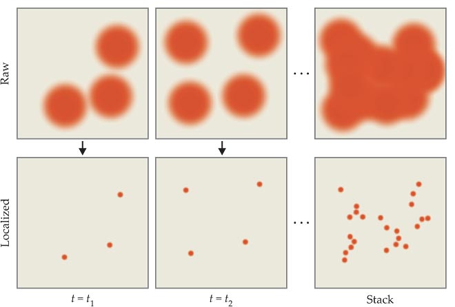 Figure 2. Pointillism writ small. Due to diffraction effects, describable through point-spread functions, fluorescing molecules appear in raw images as diffuse spots much larger than the molecules themselves. By activating only some of those molecules at any given time t, to ensure that no two point-spread functions overlap, one can fit each point-spread function to a Gaussian distribution and precisely localize the subset molecules’ coordinates. Repeating the process and then stacking the localized images reveals features much smaller than the diffraction-limited point-spread functions. (Adapted from A. Miyawaki, Nat. Rev. Mol. Cell Biol. 12, 656, 2011, doi: