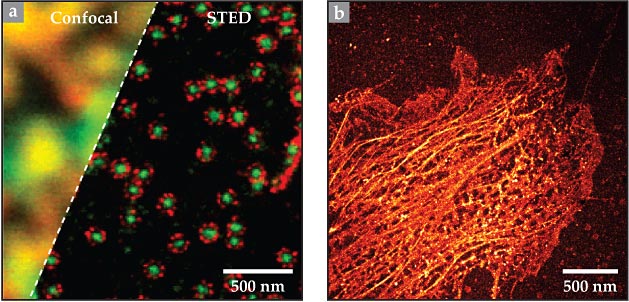 Figure 3. Under the nanoscope.(a) Nanoscale pores (green) and the proteins (red) that anchor them to the nuclear membrane are obscured in a confocal microscopy image of a frog cell but clearly visible in a stimulated emission depletion (STED) image. (Adapted from F. Göttfert et al., Biophys. J.105, L01, 2013, doi: