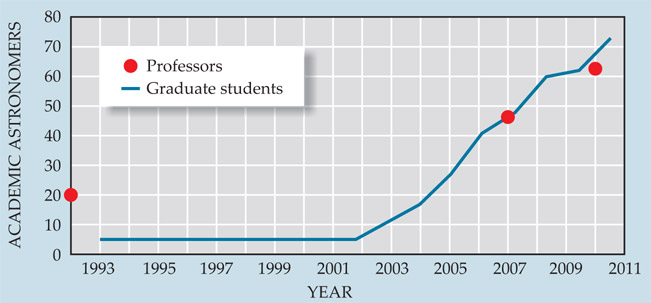 In the past decade, the numbers of students entering astronomy programs in Chile has skyrocketed (see graph on page 3). The growth is tied to an overall expansion in universities and university attendance, says PUC astronomy professor Alejandro Clocchiatti. But for astronomy, “it’s like we are surfing a wave. We don’t have to make the wave—it’s made by the US, Europe, China, and Japan. We don’t need to have world-class might to do world-class astronomy. Many institutions see this as an opportunity.” When PUC started an undergraduate program in astronomy, he says, the physics program “passed from gathering mediocre students to very good students.” Clocchiatti says astronomy “allowed kids finishing high school to stand up to social pressures against being a scientist.