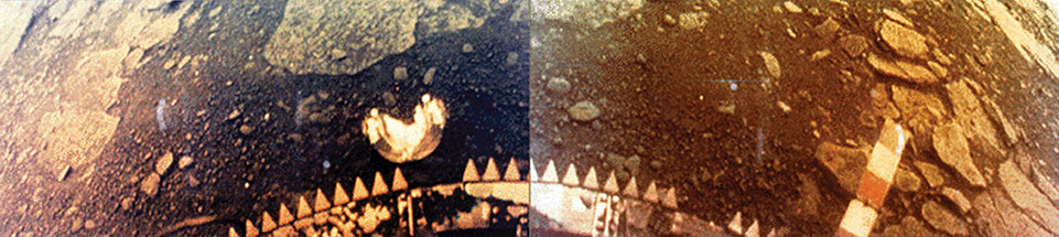 Figure 1. The surface of Venus, as captured in true color by the Venera 13 lander during the 127 minutes its instruments remained functional on the planet’s surface. The base of the spacecraft appears surrounded by flat rock slabs and soil, and the entire scene appears orange because the planet’s thick atmosphere efficiently filters blue light from incident solar radiation. (Adapted from ref. 7.)