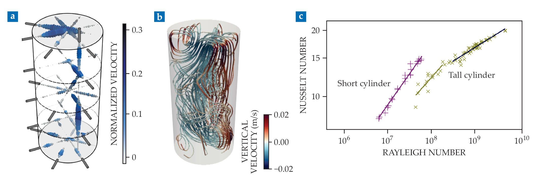 Earth’s outer core is more than 2000 km thick, so its Rayleigh number is many orders of magnitude larger than can possibly be studied in a lab or simulated on any present-day computer. In their push to higher Rayleigh numbers, Vogt and colleagues chose to use a cylinder taller than it is wide, so they could make the best use of their costly and cumbersome GaInSn. In their previous work on convective turbulence, they’d always used containers as wide or wider than they are tall. All those systems—by necessity, much shorter than 64 cm—featured stable, large-scale circulation. 3