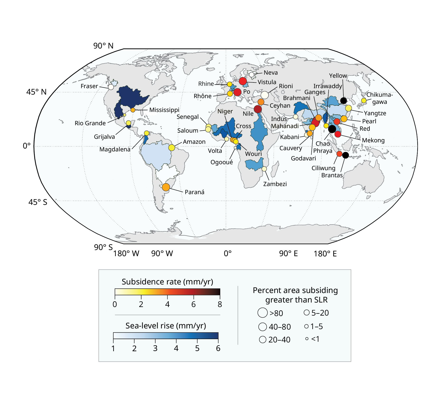 Forty delta systems across five continents were examined for the study. For each delta, the size of the circle reflects the percentage of the delta area that is sinking faster than the local rate of sea-level rise (SLR), and the color reflects the average rate of subsidence. The river basin—the area of land that drains into the river—is outlined for each system and shaded blue according to the rate of sea-level rise at each delta.