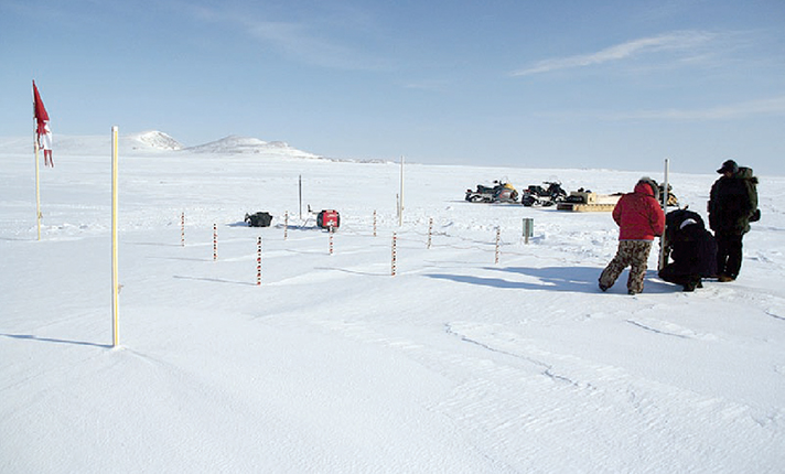The Siku-Inuit-Hila project was a 2006–13 collaborative study of sea ice that teamed scientists with members of Inuit communities in the US, Canada, and Greenland. Here, team members install an ice-thickness monitoring station. (Image courtesy of Shari Gearheard.)