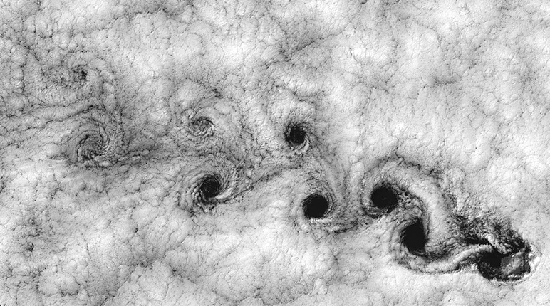 Figure 1. A von Kármán vortex street is the periodic chain of countercirculating eddies that can form in the wake of a fluid moving over an obstacle. In this case, a satellite captured the pattern in the movement of clouds flowing over an island off the coast of Chile. (Courtesy of NASA.)